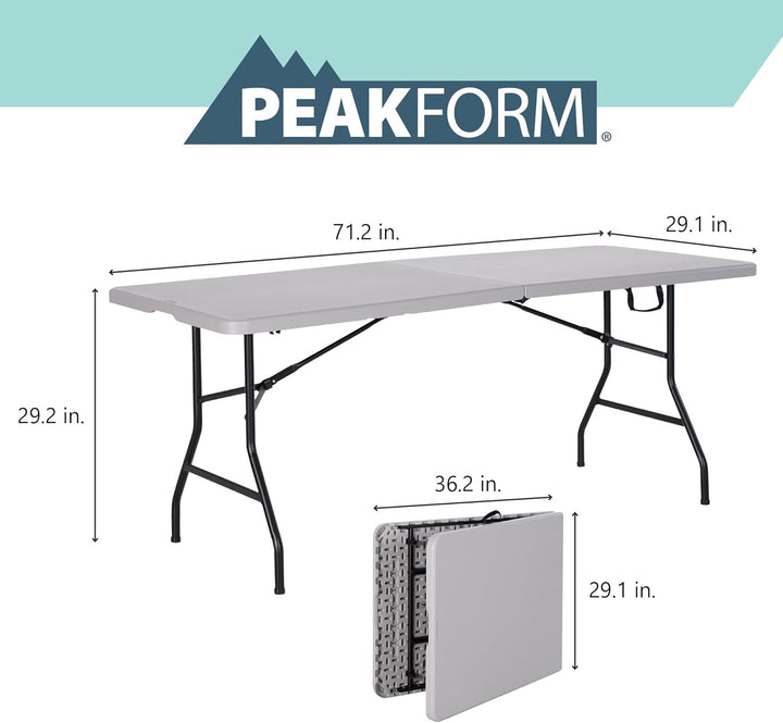 Become the ultimate host and impress your guests during every visit. Whether you need more seating space for a family dinner or birthday party, the Peakform 6-Foot Centerfold Table is a great option for every occasion. Carry the table with ease and quickly setup anywhere around your home with the lightweight build and foldable design. Maintain a great looking table for years with the easy to clean table top. After every use, storage is a breeze with the space saving centerfold design. Make any gathering a seamless hosting experience with the 6-Foot Centerfold Table.