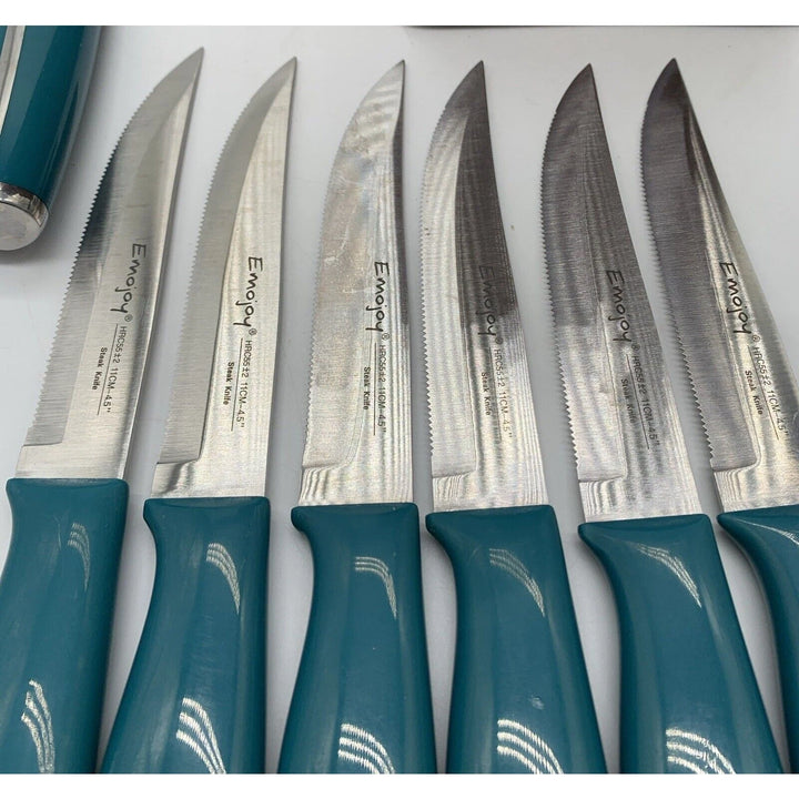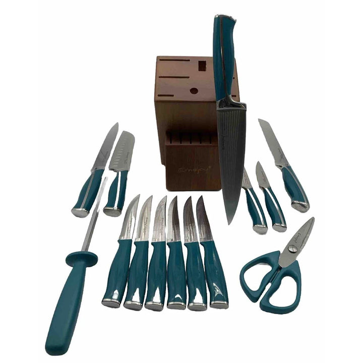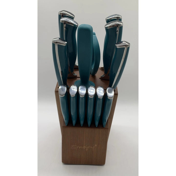 Upgrade your kitchen with this Emojoy ARC Series Kitchen Knife Set with Block. Crafted from high-quality German stainless steel, this 15-piece set includes a variety of knives and a sleek base for storage. The knives come in a beautiful blue color and feature a comfortable grip for easy use. Perfect for any home chef, this set is sure to impress.