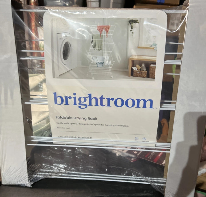 The Brand New Brightroom 3 Tier Coated Steel Foldable Drying Rack is a modern, silver-colored clothes drying rack made of steel. It features a solid pattern and a medium size, suitable for adults' clothing. This free-standing rack is convenient for drying clothes in a compact space and can be easily folded for storage when not in use. With a height of 43 5/16 inches, this unit from Brightroom is a practical addition to any home's laundry supplies.
