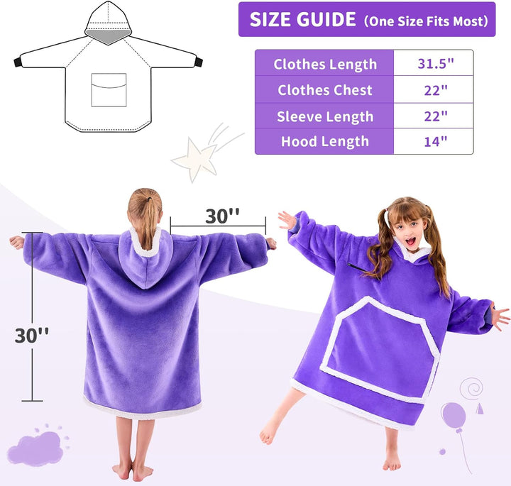 - ONE SIZE FIT ALL: This blanket hoodie for kids is large enough for most. The kids wearable blanket with giant hood keeps your children staying warm and cozy whether outdoor or indoor spaces. Soft and elastic cuffs, you don't need worry about slipping or sliding sleeves. Two large pockets can be used to store items such as mobile phones, keys, snacks or just put their hands into the pocket to keep warm