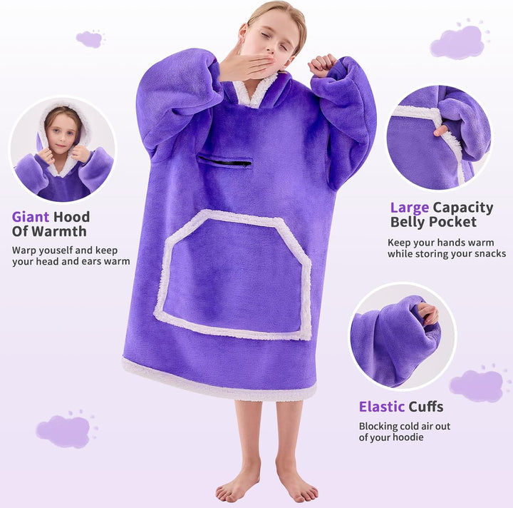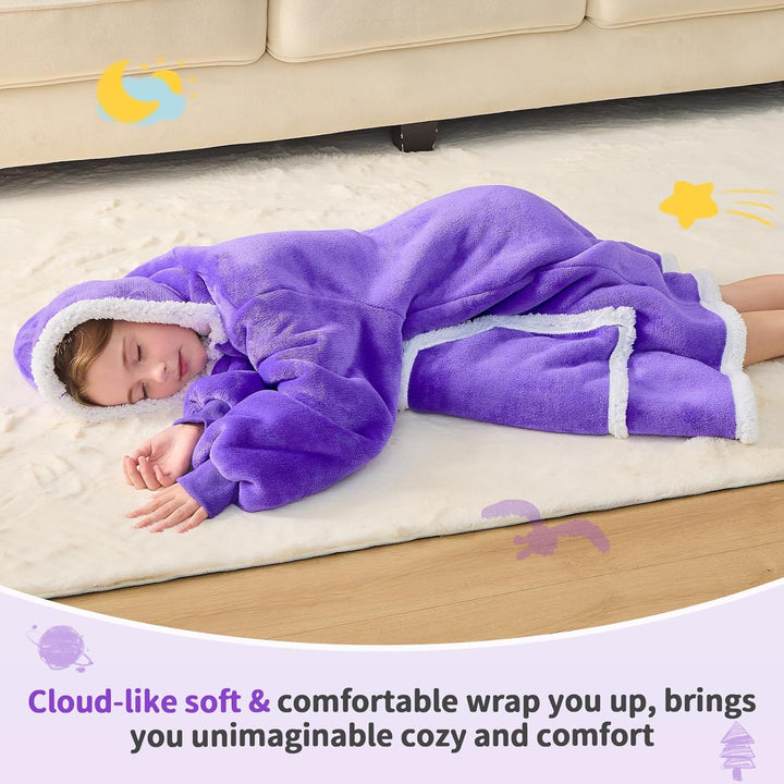 - EXCELLENT SOFT & WARM FABRIC: Our blanket hoodie for kids is made of two layers of cozy soft and skin friendly fabrics. Luxurious flannel fleece microfiber on the outside, premium fluffy sherpa fleece on the inside, which makes this hoodie blanket for kids ultra soft and warm. This kids blanket hoodie can be fully machine washable and tumble dried on low that saves you a lot of work. Our kids wearable blanket can maintain the original comfort even after many washes