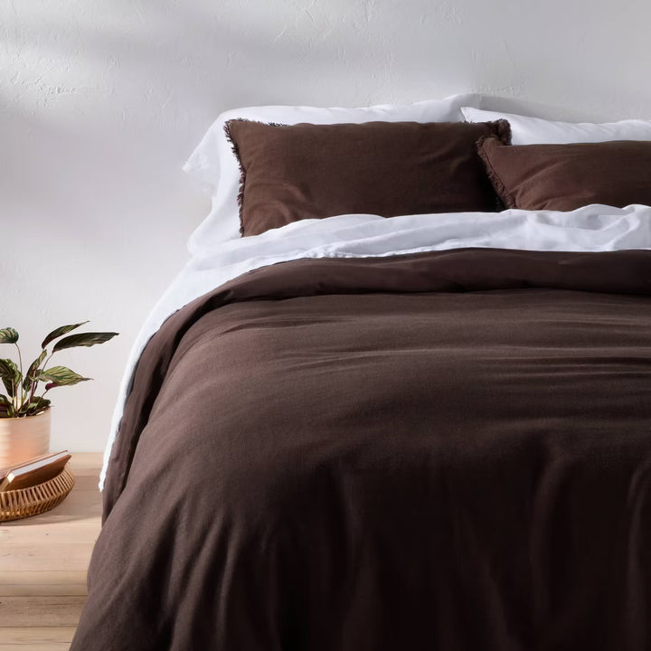 Add a touch of elegance to the top of your bed with this Heavyweight Duvet Cover and Sham Set from Casaluna™. The duvet cover comes in a solid shade and features a hidden zipper closure for a polished look that also makes it easy to add or remove an insert. Plus, it includes 2 pillow shams for a coordinated look. Rayon and linen are blended for an exceptionally soft feel and the 74-thread count cover is machine washable for convenient care.