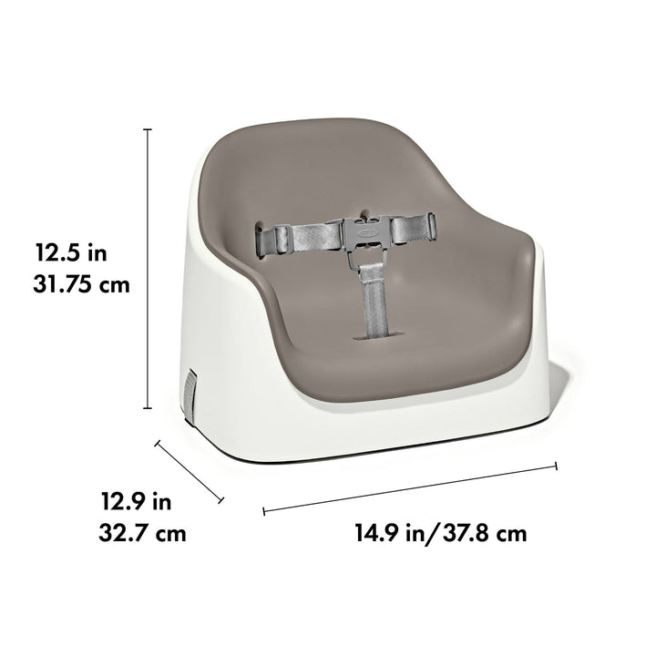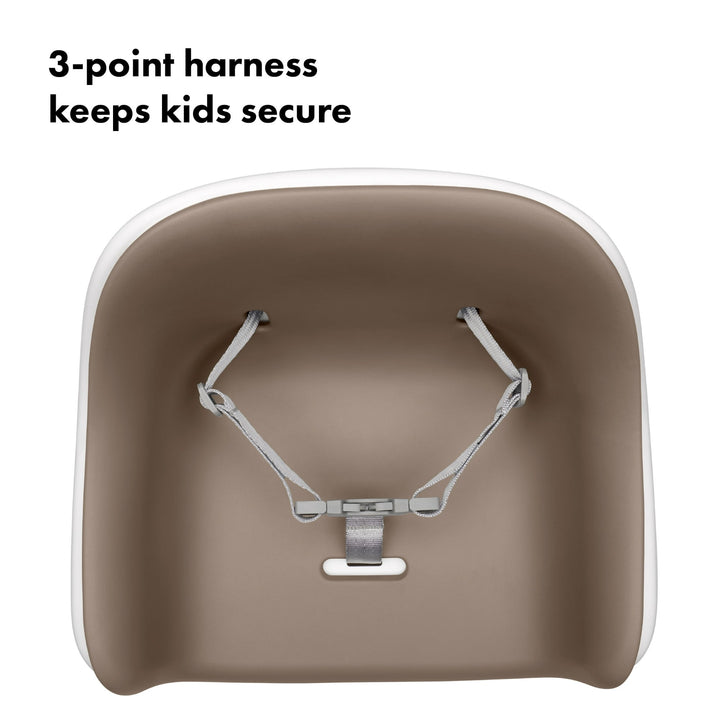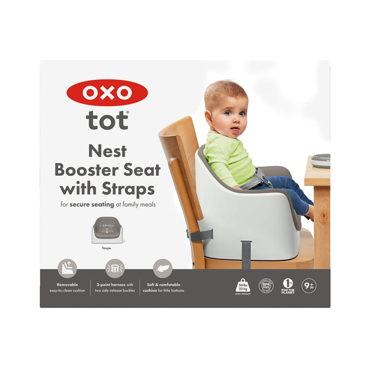 The OXO Tot Nest Booster Seat with Straps is a secure and supportive toddler booster seat that helps bring little ones to the family table. Designed for children as young as 9 months and up to 50 lbs, this booster seat for table use features a high back and supportive sides to keep your child comfortable during mealtime. The soft, removable cushion provides comfort and is easy to clean, making it ideal for everyday use. With adjustable back and bottom chair straps, this baby booster seat with straps securely fits a wide variety of dining chairs. Two side-release buckles and a 3-point harness system help keep even the most active toddlers safe. Non-slip feet keep the dining chair booster stable and protect your furniture from scratches. When it’s time to go, the built-in carry handle makes transport easy, and the straps tuck away neatly into a hidden storage compartment.