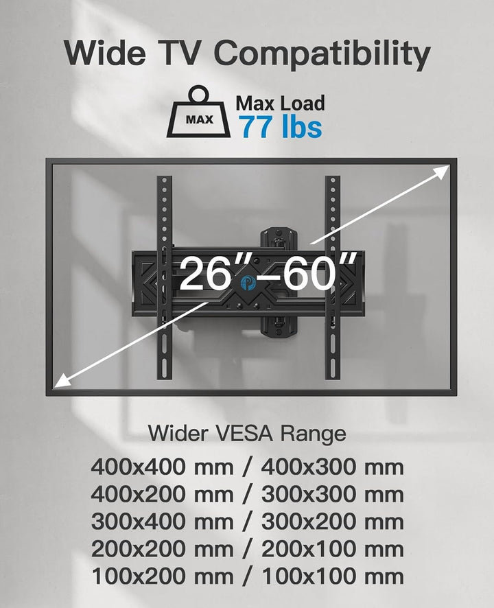 Pipishell Full Motion TV Wall Mount for 26-60 Inch Flat Curved TVs, Heavy Duty Single Articulating Arms TV Bracket Up to VESA 400x400mm and 77lbs, Support Swivel, Tilt, Level Adjustment