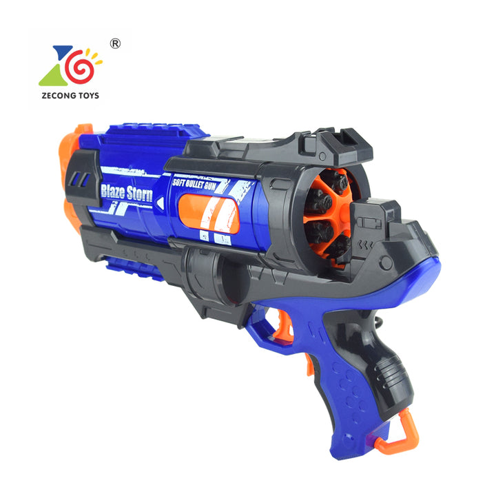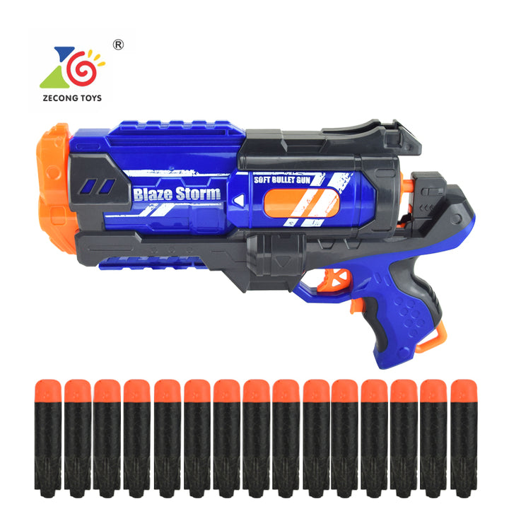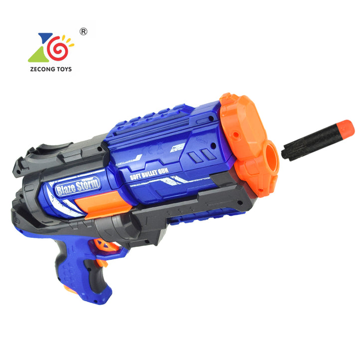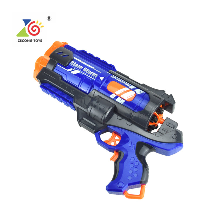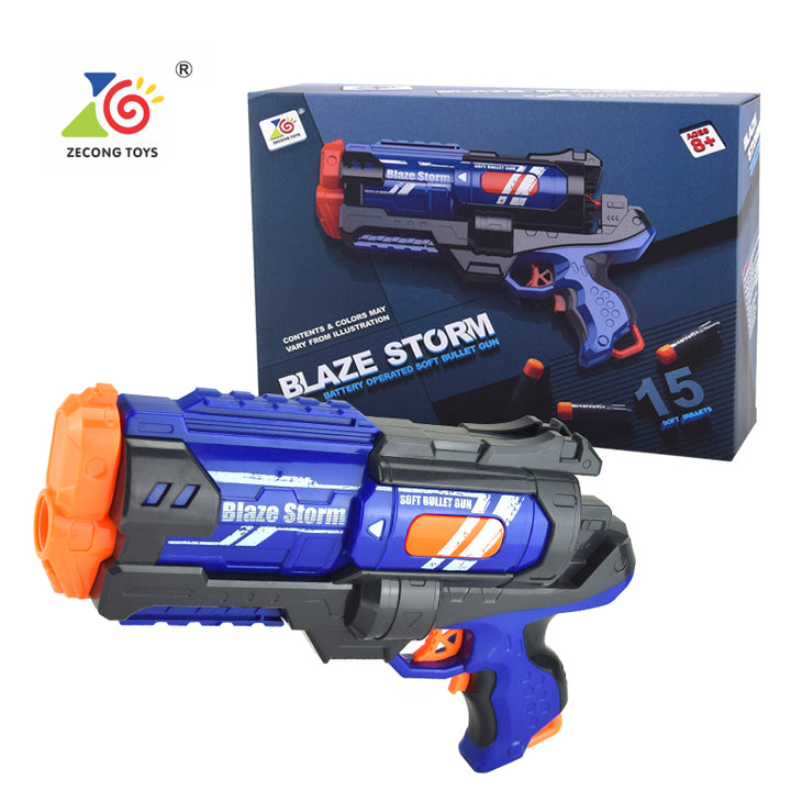 Product Description BLAZE STORM Rapid Fire Machine Gun Rifle Blaster gun Toys Soft Bullet gun Kids Play Item No. ZC7131 Description Battery soft bullet gun with 15PCS soft bullet Gun size 32*7*21cm Box size 33.2*8.7*23cm...
