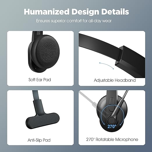 - Comfortable for Long Time Wear: Our Bluetooth headset with microphone features in ultra soft earmuff with adjustable headband and stays securely in place. And it’s very lightweight. The 270°rotatable microphone can be used on the right or left side, you can wear it either on your left or right ear. And you can adjust the microphone close to your mouth to make the sound more clear.