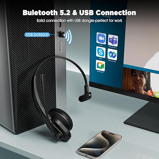 - With USB Dongle: Our Bluetooth headset with USB dongle, which is perfect for work on computer, even if there is no Bluetooth function on your computer. Just need to plug the USB dongle to your computer and they will pair fast and easily. NOTE: Please don’t forget to set “M99+” as audio input and output on your computer. And you could also connect it with your cell phone by Bluetooth, then you won’t miss important calls.