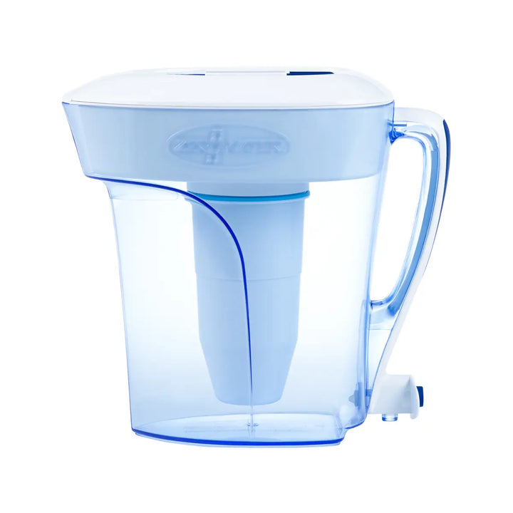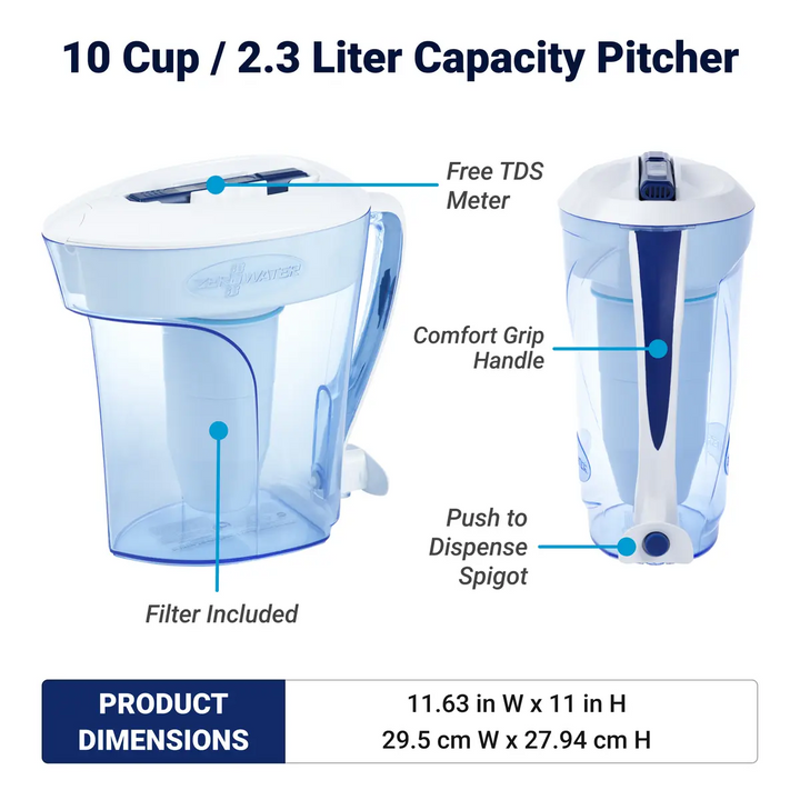 -Ideal for any household size, the Culligan ZeroWater 10 Cup Pitcher with 5-Stage Water Filtration delivers filtered water while saving space. Its compact design fits seamlessly into any size kitchen. The Culligan ZeroWater water filter removes virtually all total dissolved solids (TDS), including metals and salts, ensuring the purest taste in every sip. Culligan ZeroWater is IAPMO-certified to reduce lead, the forever chemicals PFOA/PFOS, chromium, and mercury, providing peace of mind that every glass of water is healthier and cleaner. The comfortable grip handle and easy-to-use push-to-dispense spigot make filling your cup, bottle, or jug effortless.